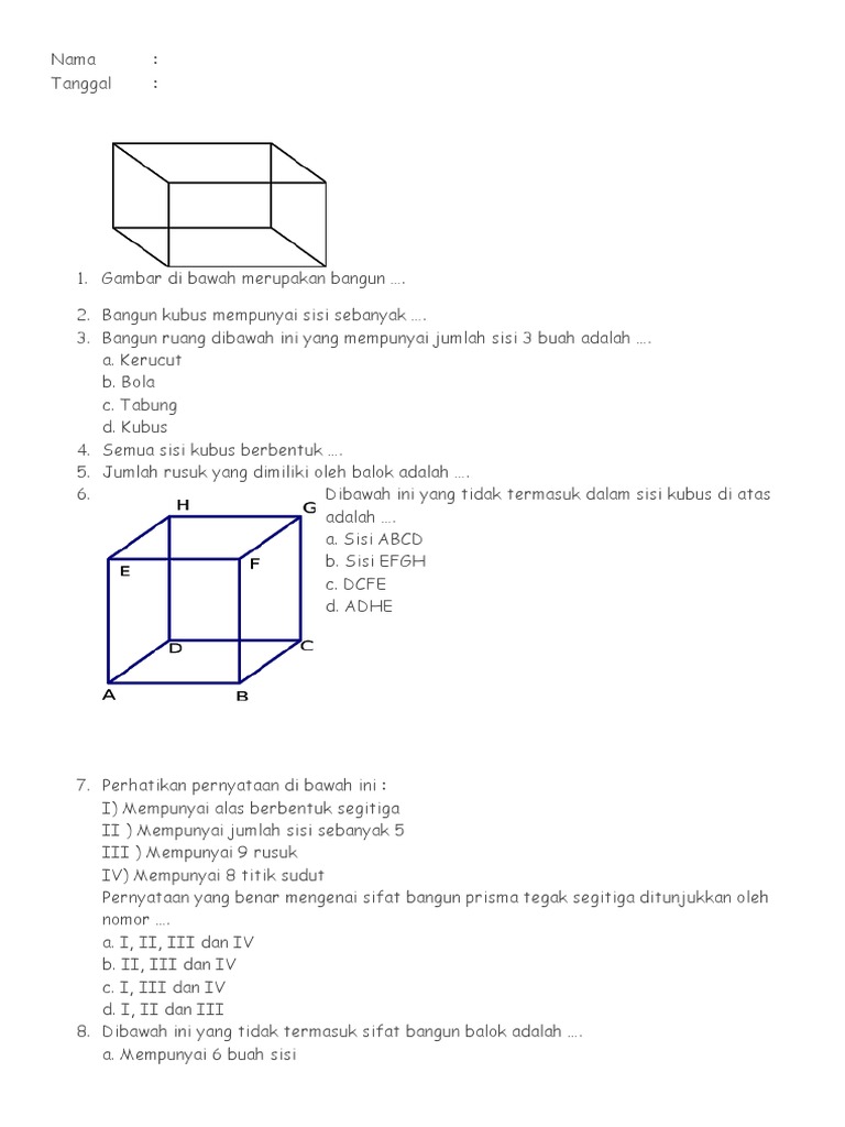 Soal Matematika Kelas 4 Sd Bab Bangun Ruang Dan Kesimetrian Bangun Datar