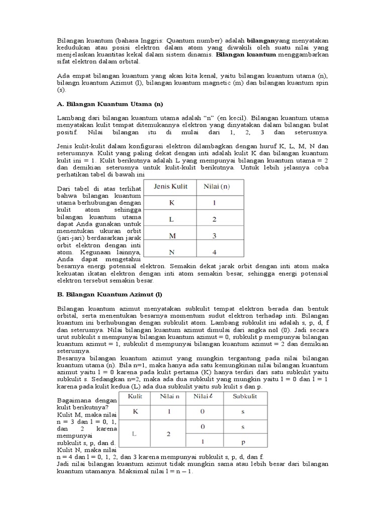 Kim Bilangan Kuantum 1 Bilangan Kuantum Bilangan Kuantum A Pendahuluan Bilangan Kuantum Adalah Suatu Harga Yang Menyatakan Keadaan Orbital Suatu Atom Pdf Document